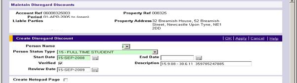 In order to ensure the correct level of reduction is applied to the account, once the person status has been updated for all student occupants then the appropriate person should be selected for the Discount Disregard to be awarded against.